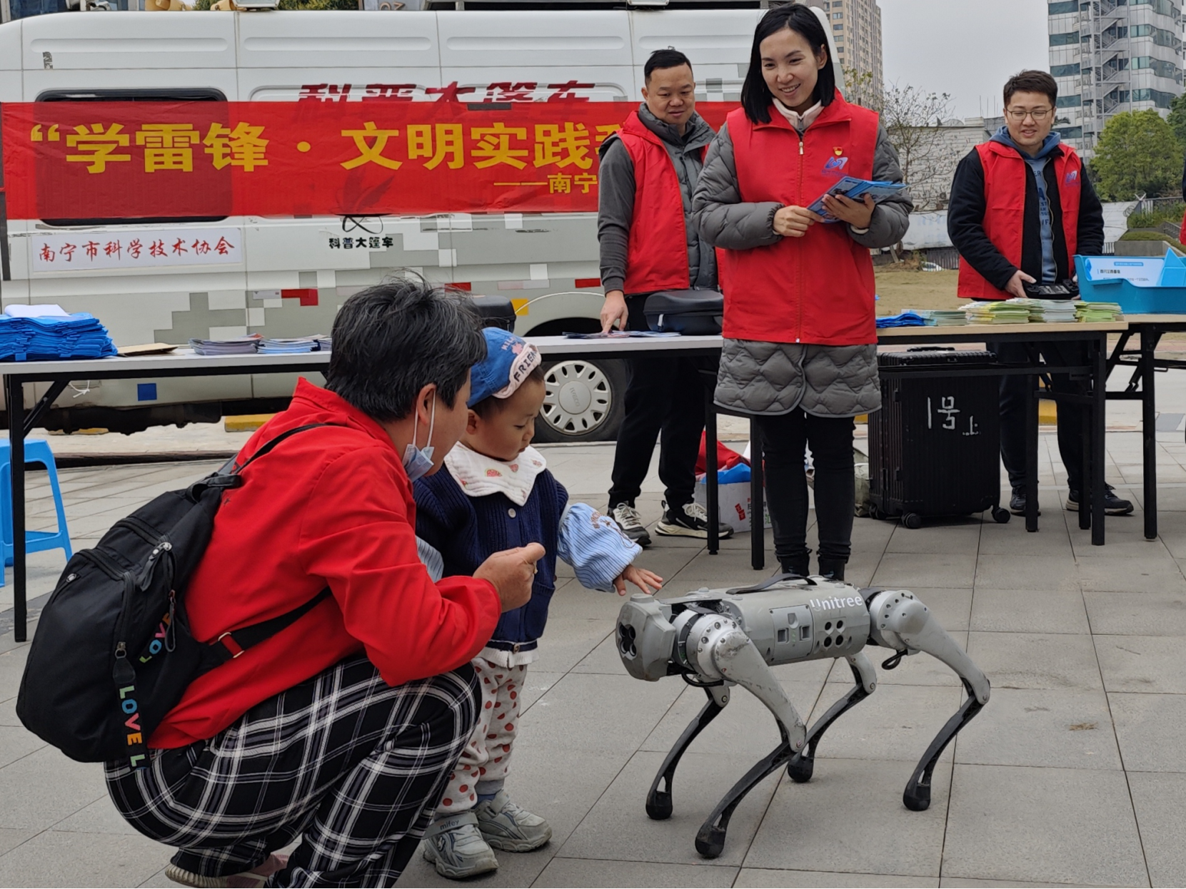 ?活动中,党员干部和科技志愿者给社区居民带来了智能机器人、机器狗等前沿科普展品,并邀请群众体验VR眼镜、跟踪拍摄无人机等,通过现场讲解,结合沉浸式体验,引导群众深刻认识科技发展对于生产效率、生活质量带来的便利和高效。现场还向群众发放了《中华人民共和国科学技术普及法》《提升广西公民科学素质系列读物》等科普资料500余本,以及科普宣传手册800余份,深受居民热烈欢迎。